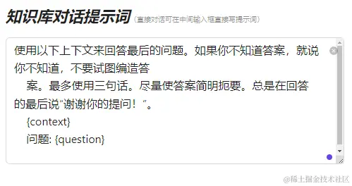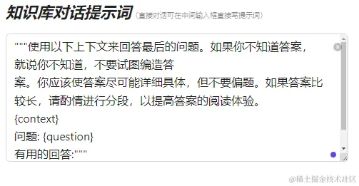 - 知识库对话可以自己填写提示词来不断迭代提示词,取得更好的效果,默认用教程里面的提示词。
