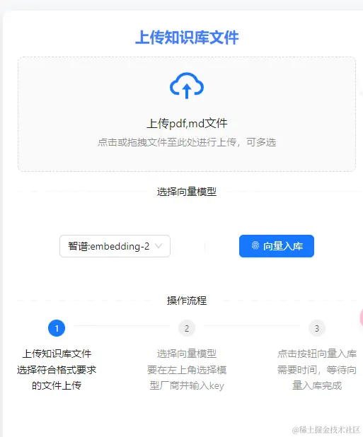 - 知识库对话需要在右边上传文档界面先上传pdf或者md文件上传并向量入库,可以选择不同厂商的embedding模型,现在有智谱和openai的,默认是智谱的模型。