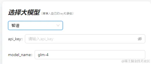 - 可以选择大模型厂商,填写自己的key和模型等参数,现在支持智谱,openai,讯飞星火,百度文心这几家的模型,默认用的智谱glm4。