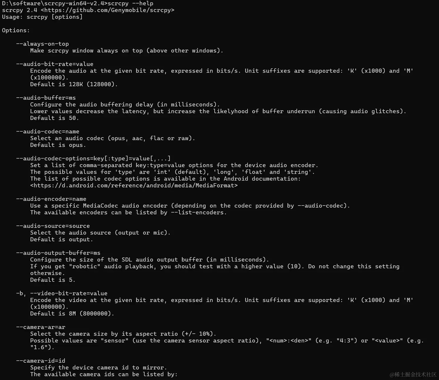 诸如此类的命令参数还有很多,执行scrcpy --help就可查看详细的帮助文档。