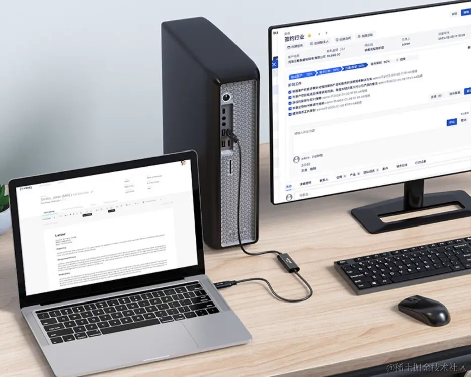 连接两台电脑的USB端口即可,会自动安装驱动,那根线实际上就相当于是一个文件中转器,可以实现剪切板、文件的互传。使用体验就跟一台电脑连接了两台显示器一样。如下图所示: