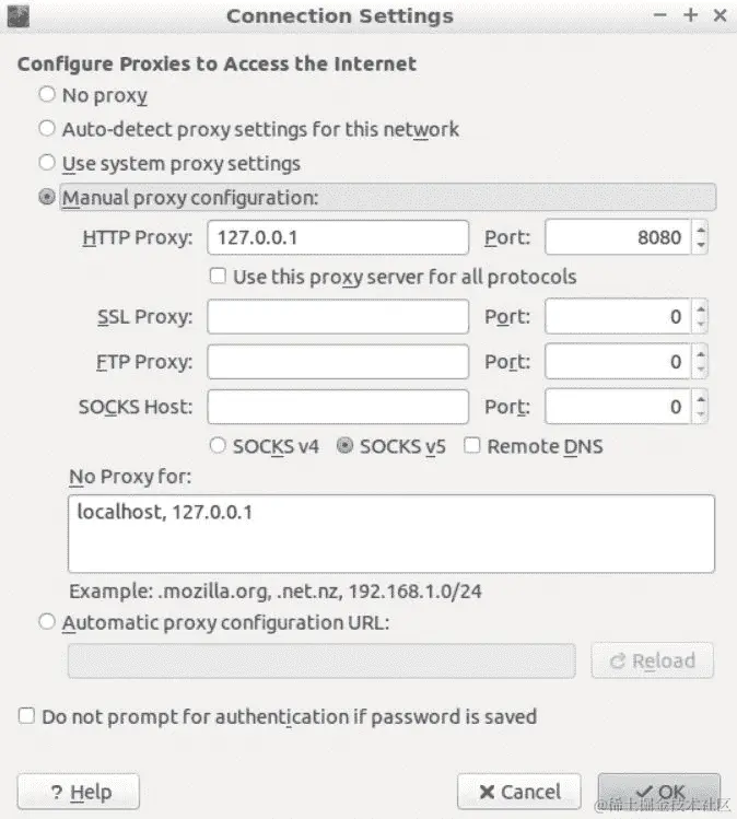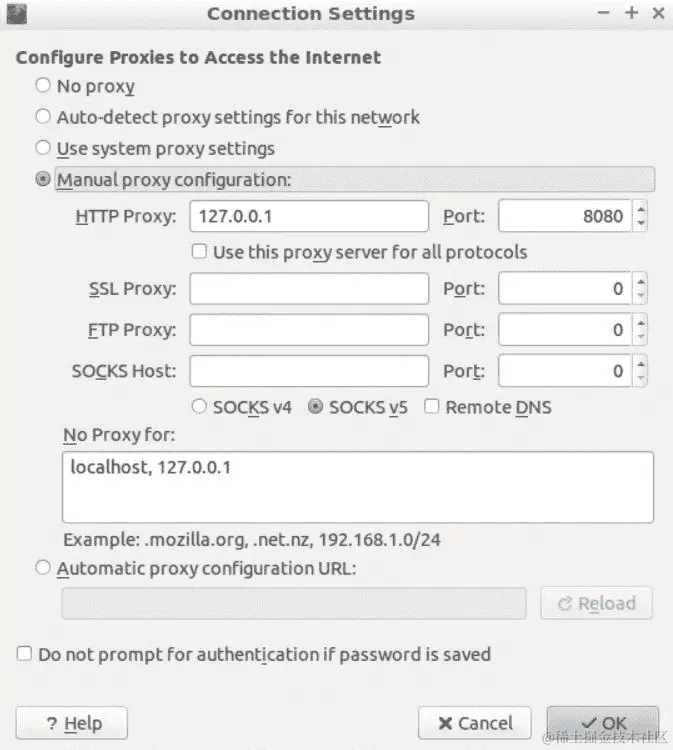 让我们点击浏览器右侧的打开菜单图标,然后进入首选项 | 高级 | 网络 | 连接 | 设置... | 手动代理配置。将 HTTP 代理设置为127.0.0.1,端口设置为8080,然后点击确定: