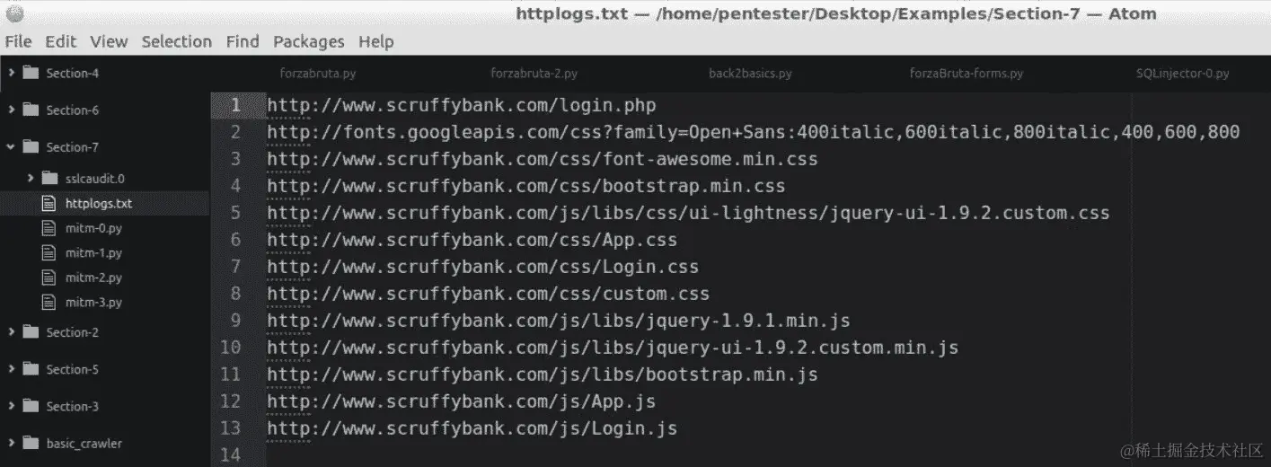 让我们关闭控制台并查看httplogs.txt文件。我们可以用编辑器打开它。我们可以看到会话中请求的所有 URL: