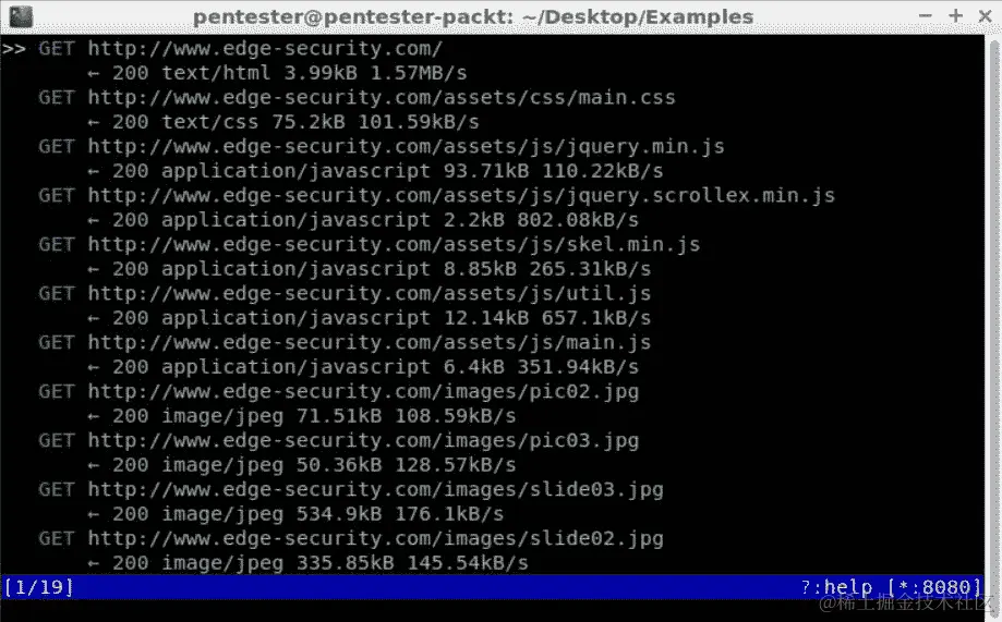 现在让我们在浏览器中加载www.edge-security.com/;你可以在控制台中看到请求历史记录:
