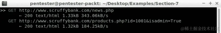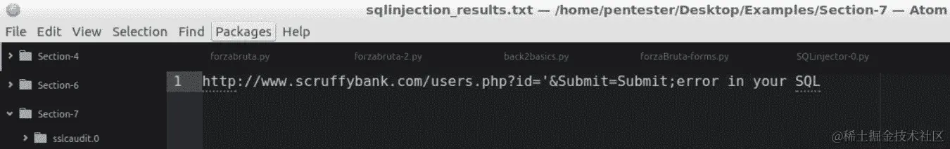 让我们去终端,运行mitmproxy -s mitm-3.py,然后在应用程序中浏览。最后,转到www.scruffybank.com/users.php。我们知道这个页面在之前的练习中容易受到 SQLi 攻击,例如,通过在用户 ID 中输入1,这对于演示来说应该足够了。关闭 mitmproxy 并在编辑器中检查sqlinjection_results.txt文件日志。