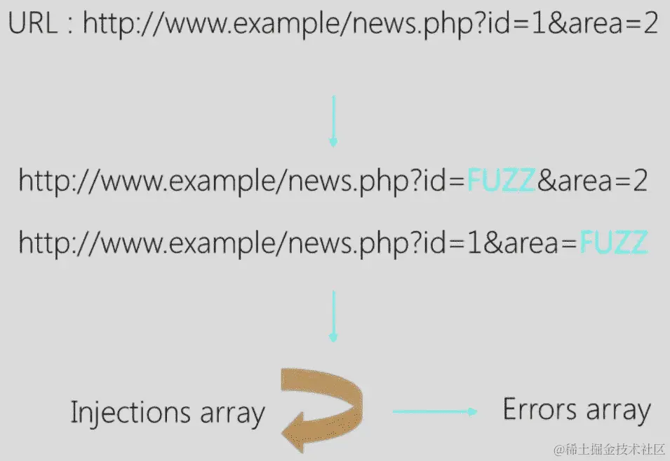 因此,对于每个具有参数的 URL,我们需要将每个参数值替换为 FUZZ,同时保留其他参数值。我们这样做,而不是一次替换所有值为 FUZZ。然后,我们将每个 URL 中的 FUZZ 字符串替换为injections数组中的每个值。