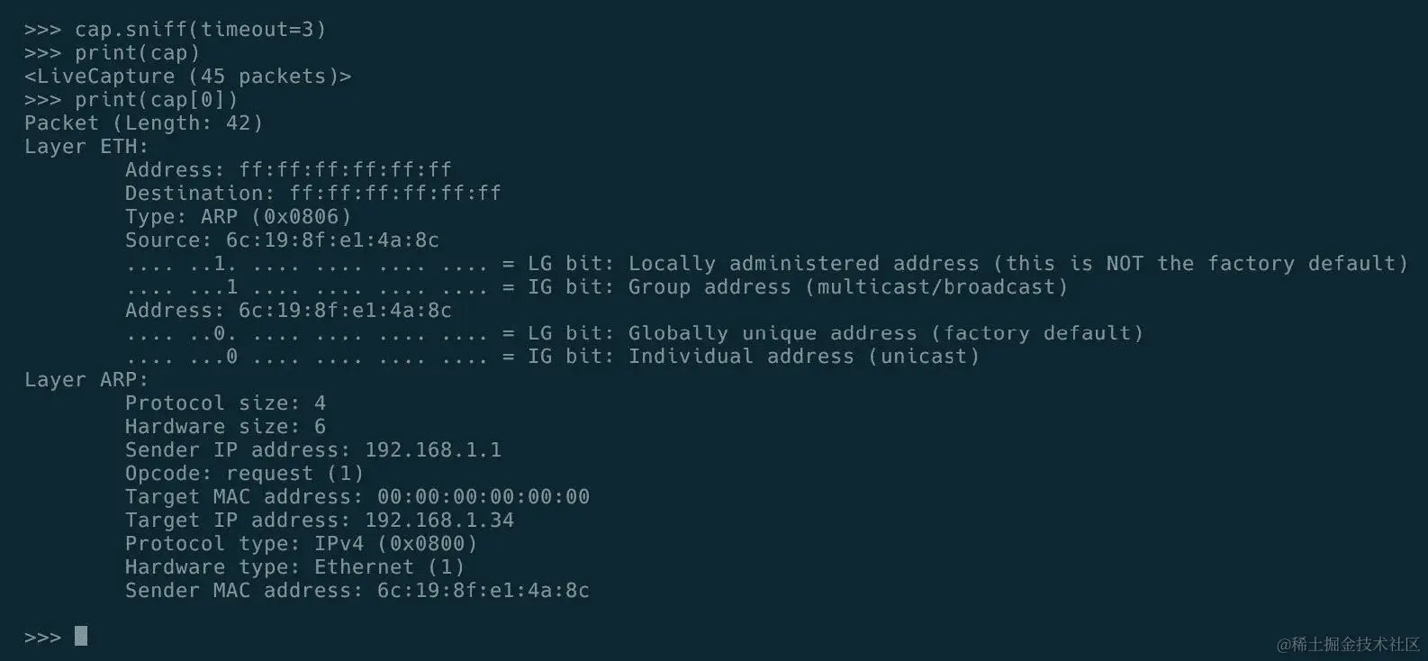 输出将打印所有被嗅探到的数据包。因此,它会一直打印,直到我们用键盘中断停止。输出如下: