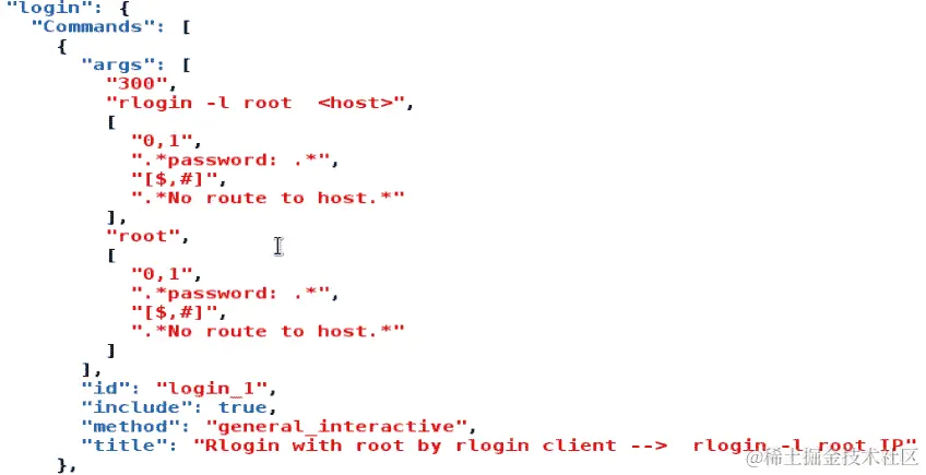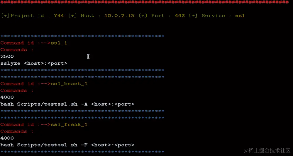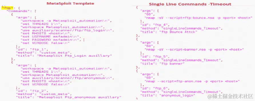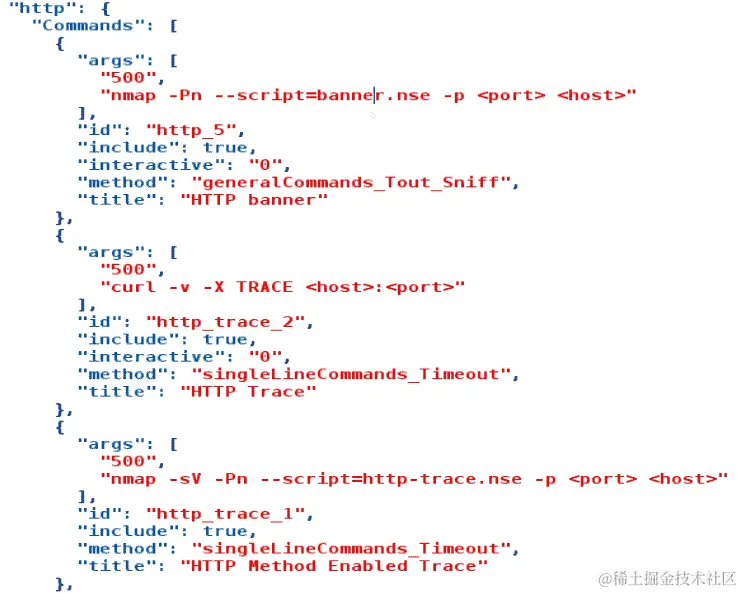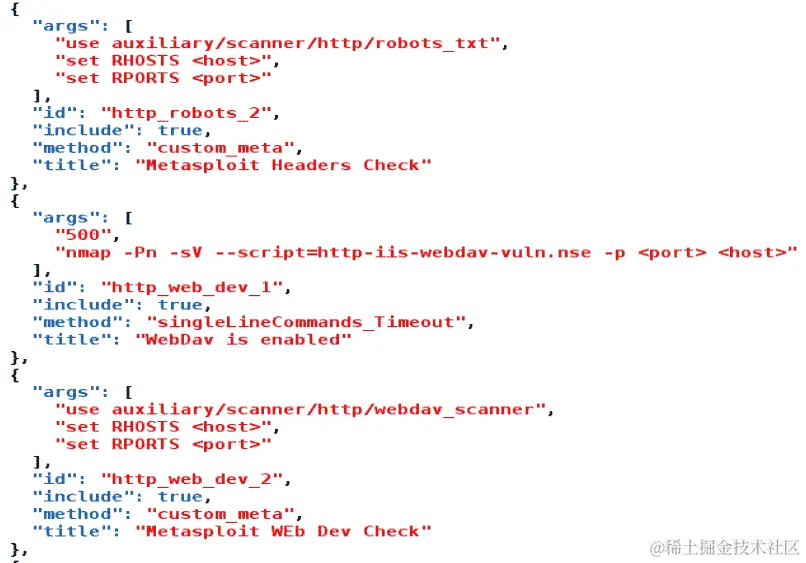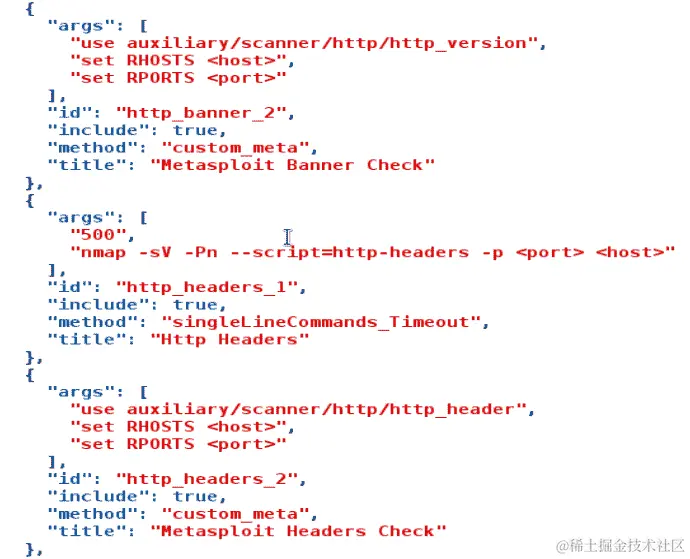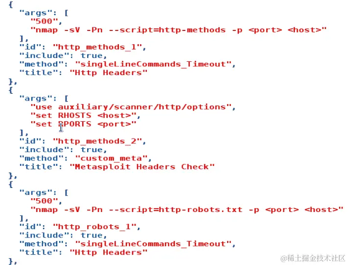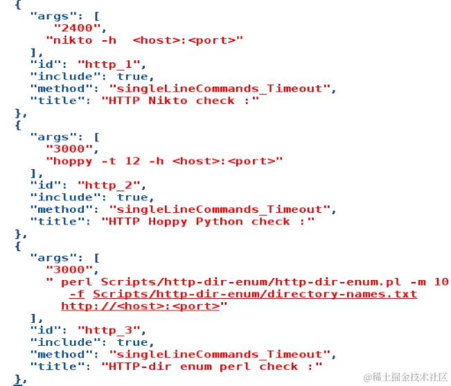 在端口扫描的情况下,用户将收到端口扫描结果,并有选择重新配置结果(以减少误报)。最终配置设置后,将开始服务扫描。逻辑是从数据库中逐个选择一个主机,并根据发现的服务,从 JSON 文件中读取适当的脚本,并为该特定主机执行它们。最后,在执行脚本后,结果应保存在数据库中。这将持续到所有主机都扫描其服务为止。最后,将生成一个包含格式化结果和 POC 截图的 HTML 报告。以下截图显示了如何配置 JSON 文件以执行脚本: