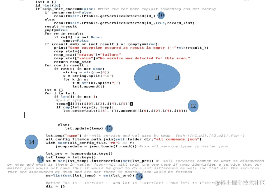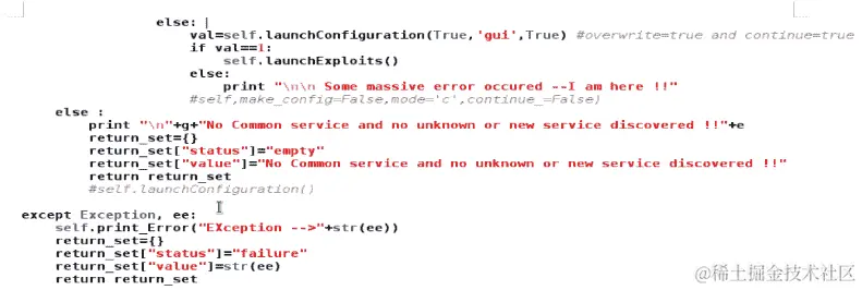 在代码片段中显示的第**(17)和(18)**节中,我们再次将两个未发现和映射的服务重新构建为两个不同的字典,格式如前所述:{"ssh":[[10.0.2.15,22,open,OpenSSH-7.2p2 Debian 5;10]],...}。发现的服务将放在dic字典中,然后放入self.processed_services类变量中。未发现的服务将放入ms_dic,最终放入self.missed_services中。