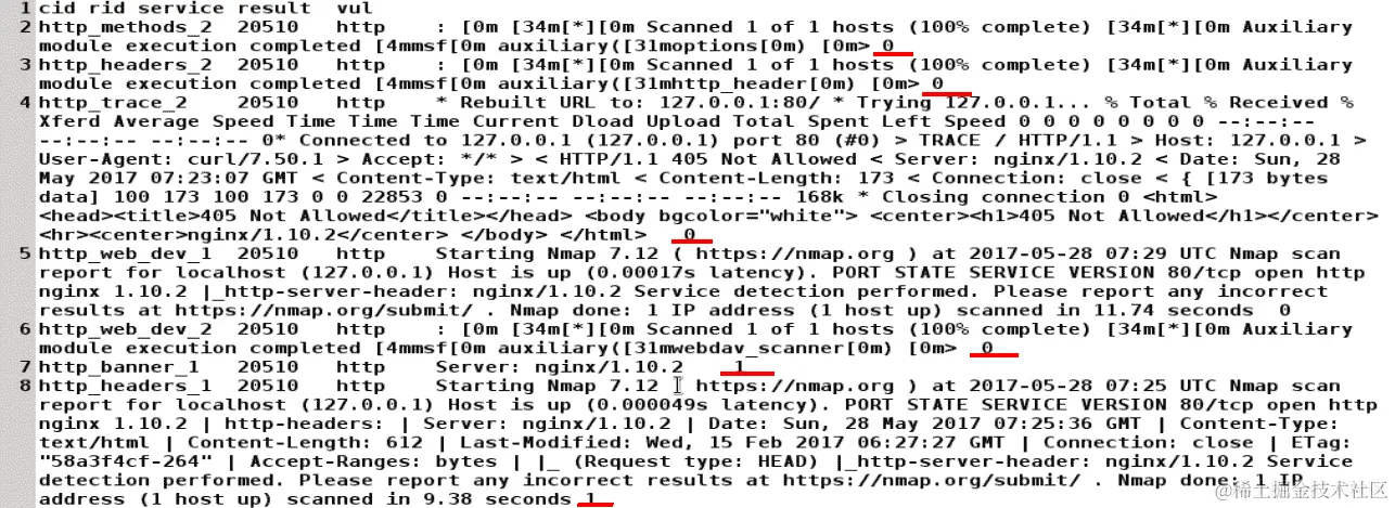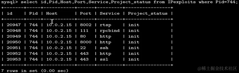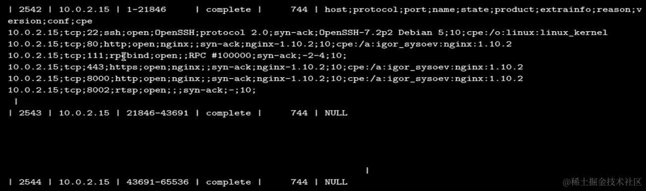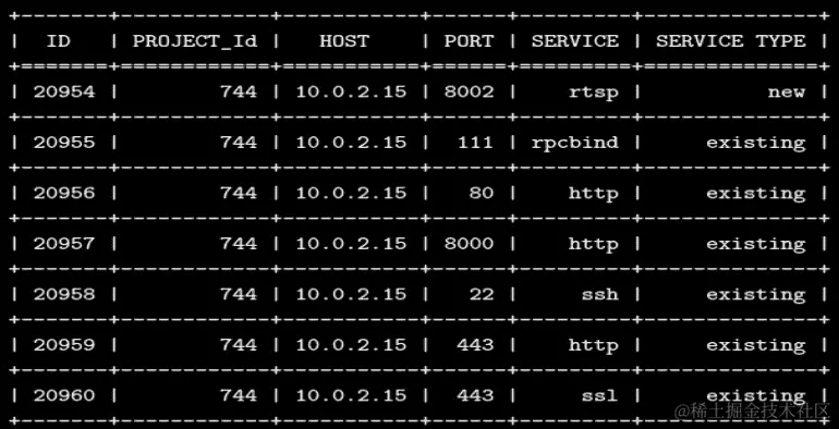 我们可以从前面的屏幕截图中看到,基本上有三条记录对应于我们的 ID744的扫描。表列的模式是(record_id,IP,port_range,status,project_id,Services_detected[CSV_format])。