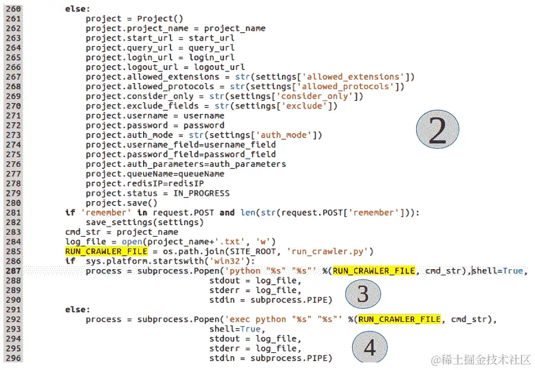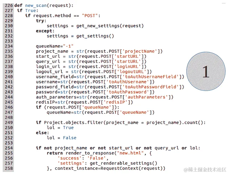 new_scan方法将接收用户的HTTP GET和POST请求。GET请求将被解析为提供用户输入项目参数的页面,POST请求将把所有参数发布到先前的代码,然后可以进一步处理。正如代码的**(1)部分所突出显示的那样,项目参数正在从用户请求中检索,并放置在 Python 程序变量中。代码的(2)**部分也是如此。它还从用户提供的设置中获取一些其他参数,并将它们放在一个名为 settings 的 Python 字典中。最后,当所有数据收集完毕,它将所有细节保存在名为Project的后端数据库表中。正如在第 261 行所示,代码初始化了一个名为Project()的类,然后从第 262 行到 279 行,它将从用户那里获得的参数分配给Project()类的实例变量。最后,在第 280 行,调用了project.save()代码。这将把所有实例变量作为单行放入数据库表中。