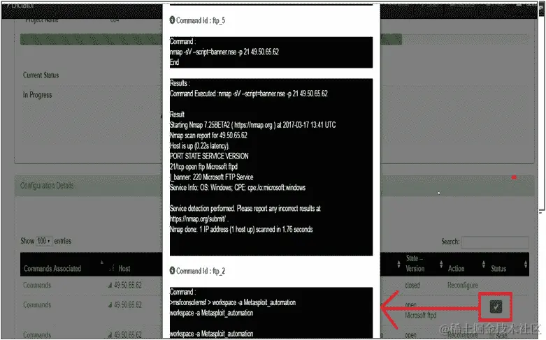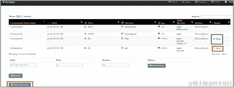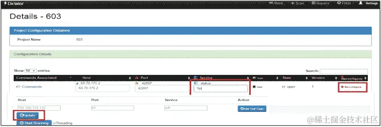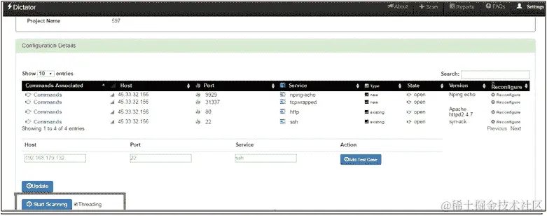 一旦选择了项目 ID,代码就会读取数据库表 IPtable_history,显示开放端口和默认配置,这指的是开放端口和相关脚本(取决于服务名称)。用户可以重新配置扫描结果,包括手动添加任何被忽略的开放端口或删除任何显示为开放但实际上不可访问的条目。一旦用户重新配置了结果,我们就可以运行服务扫描了。应该注意,如果用户发现端口扫描结果都正确,可以跳过重新配置步骤。