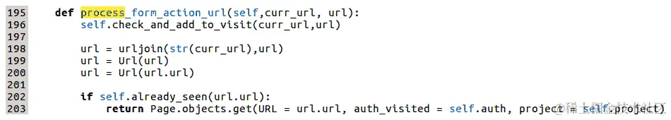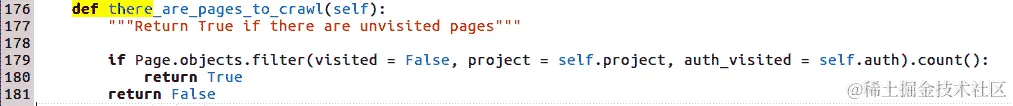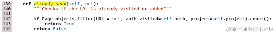 如图所示,如果第 158 行下的self.already_seen()返回false,那么在当前项目的后端数据库Page表中将创建一行。这一行再次通过 Django ORM(模型抽象)创建。self.already_seen()方法只是检查Page表,看看爬虫是否以当前项目名称和当前认证模式访问了问题 URL。这是通过访问标志来验证的: