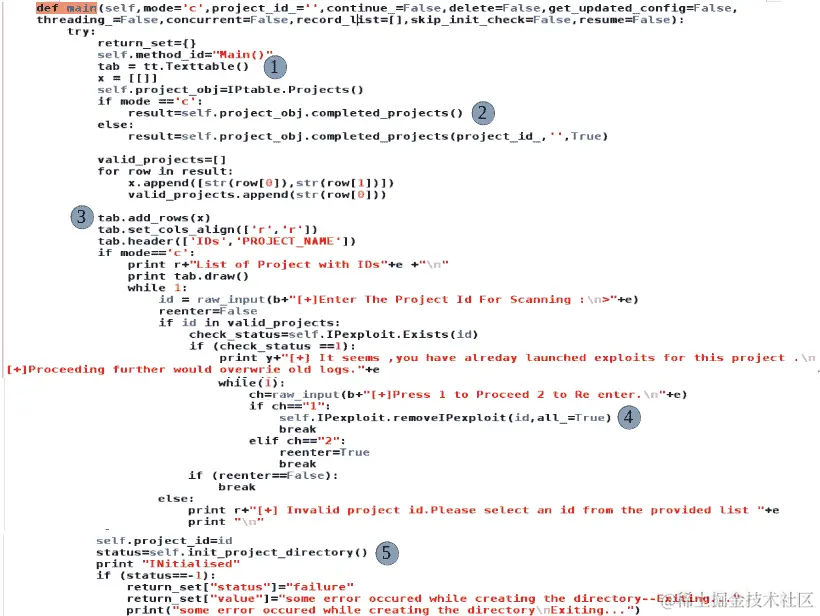 在下面的屏幕截图中标记为**(1)**的部分中,我们为texttable() Python 模块初始化了一个对象,该模块将用于在控制台窗口上绘制一个表,以显示可以执行服务扫描的项目 ID。第二部分从数据库中收集了所有已完成的项目,第三部分将检索到的行添加到程序变量中,以在屏幕上显示。随后的代码很简单。在第四部分,功能实际上删除了先前已完成服务扫描的项目的详细信息,以便用户可以用新的服务扫描操作覆盖结果: