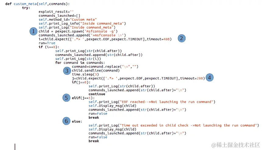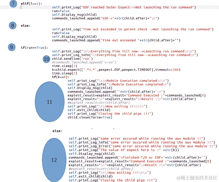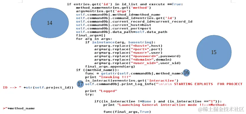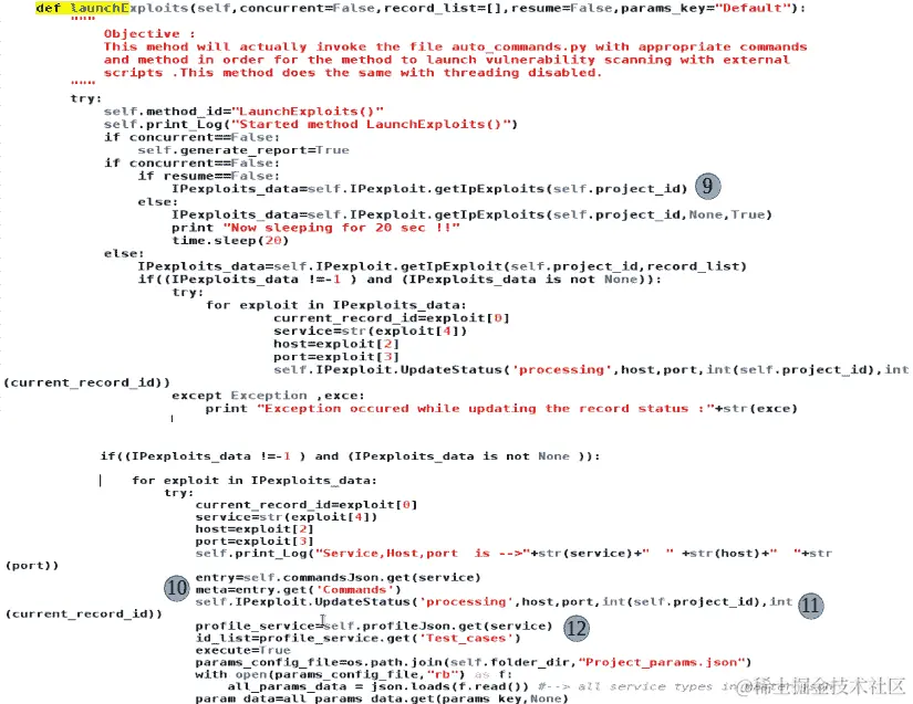 重新配置完成后,parse_and_process()将调用另一个方法launchExploits(),该方法将实际从 JSON 配置文件中读取method_name,用发现的适当主机 IP 和端口替换<host>和<port>,并将控制传递给auto_command.py模块的相关方法(根据读取的method_name)。