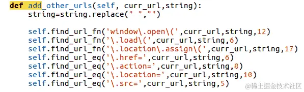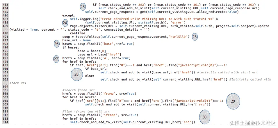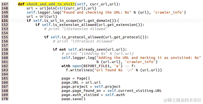 可以看到,在这个方法中首先调用的是另一个方法self.check_and_add_to_visit。这个方法检查所讨论的 URL 是否已经被添加到爬虫应该爬取的 URL 列表中。如果已经添加,则执行no9操作。如果没有,爬虫将该 URL 添加到稍后重新访问。这个方法还检查许多其他事情,比如 URL 是否在范围内,协议是否被允许等等。这个方法的定义如下所示: