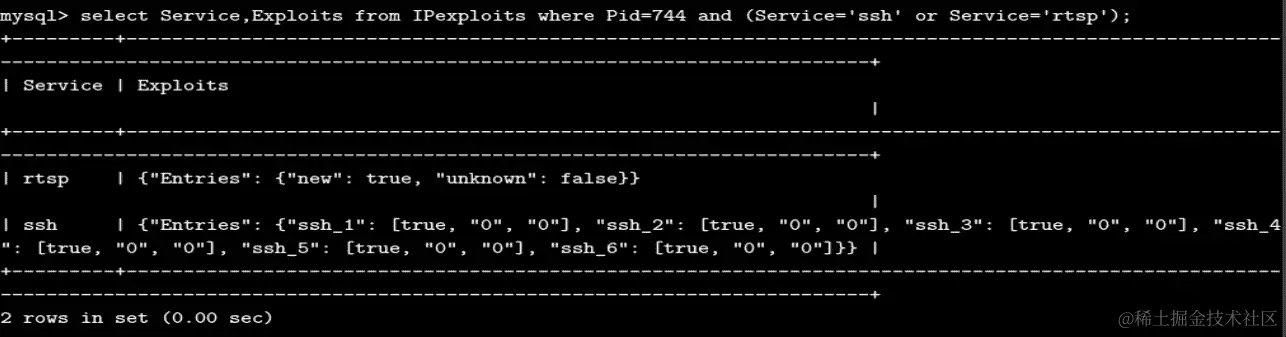在第**(7)**部分,self.IPexploit.insertIPexploits(self.rows),我们一次性将self.rows的所有数据推送到后端数据库表IPexploits中。必须记住,后端数据库中command_template/entries的数据类型也标记为 JSON。因此,我们需要 MySQL 版本 5.7 或更高版本,支持 JSON 数据类型。