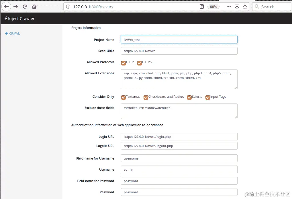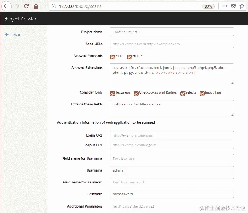 现在,让我们浏览爬虫界面,并提供以下扫描参数: