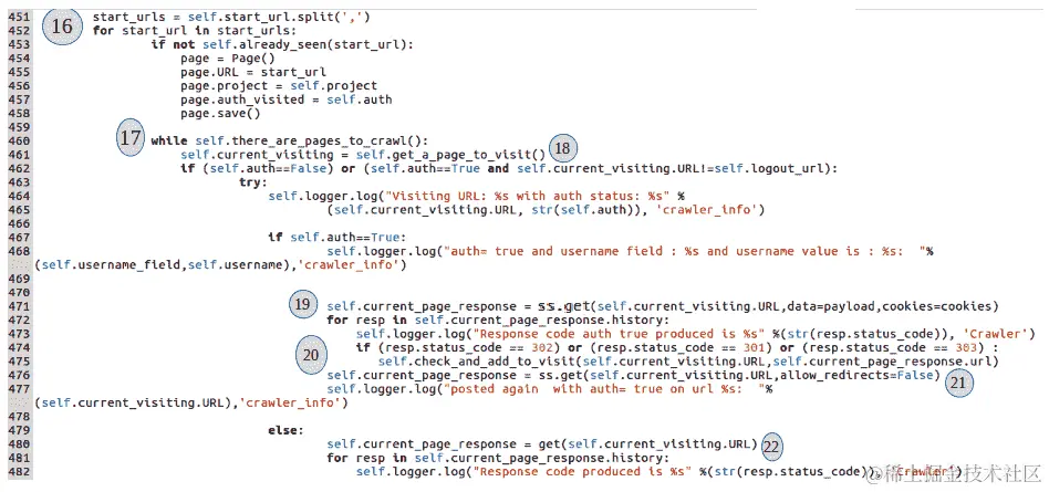 在第**(19)节中,我们向该页面发出 HTTP GET请求,同时携带会话 cookie ss,因为第(19)**节属于处理auth=True的迭代。一旦向该页面发出请求,页面的响应将进一步处理以提取更多链接。在处理响应之前,我们检查应用程序产生的响应代码。