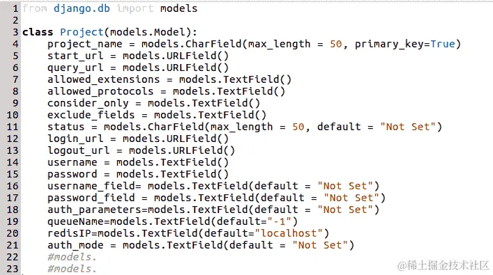 基本上,Django 遵循开发的 ORM 模型。ORM代表对象关系映射。Django 项目的模型层是一组类,当使用python manage.py syncdb命令编译项目时,这些类实际上会转换为数据库表。我们实际上不在 Django 中编写原始的 SQL 查询来将数据推送到数据库表或提取它们。Django 为我们提供了一个模型包装器,我们可以将其作为类访问,并调用各种方法,如save()、delete()、update()、filter()和get(),以执行对数据库表的创建、检索、更新和删除(CRUD)操作。对于当前情况,让我们看一下包含Project模型类的models.py文件: