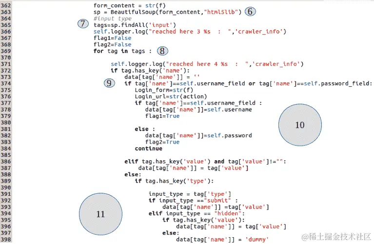 在代码的第**(6)部分,我们将当前表单的内容传递给一个新创建的 BS 解析模块的实例。这样做的原因是我们将解析并提取当前处理的表单中的所有输入字段。一旦输入字段被提取,我们将比较每个输入字段的名称与用户在username_field和password_field下提供的名称。我们这样做的原因是可能会有多个表单在登录页面上,比如搜索表单、注册表单、反馈表单和登录表单。我们需要能够识别这些表单中的哪一个是登录表单。当我们要求用户提供登录用户名/电子邮件字段名称和登录密码字段名称时,我们的方法是从所有表单中提取输入字段并将它们与用户提供的内容进行比较。如果我们两个字段都匹配,我们将flag1和flag2设置为True。如果我们在一个表单中找到匹配,很可能这就是我们的登录表单。这是我们将在其中将用户提供的登录凭据放在适当字段下并在操作 URL 下提交表单的表单。这个逻辑由第(7)、(8)、(9)、(10)、(11)、(12)、(13)和(14)**部分处理。