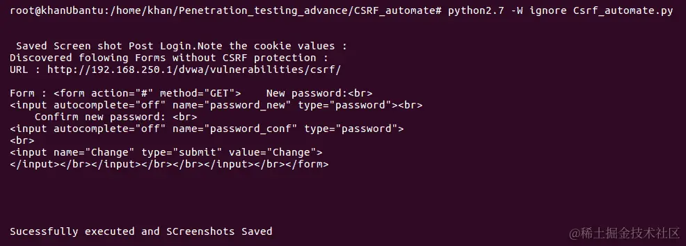 先前代码的第(41)节继续并将这些唯一的表单保存在以当前项目名称命名的 JSON 文件中。然后可以使用简单的 Python 程序解析此文件,以列出我们爬取的网页应用程序中存在的各种表单和输入字段。此外,在代码的末尾,我们有一个小片段,将所有发现/爬取的页面放在一个文本文件中,以便以后参考。片段如下所示: