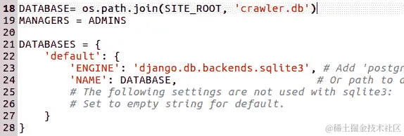 因此,当代码被编译或数据库同步发生时,使用python manage.py syncdb命令,一个名为<project_name>_Project的表将在工作数据库中创建。表的架构将根据类中实例变量的定义进行复制。因此,对于项目表的前面情况,将创建 18 个列。表将具有project_name的主键,Django 应用程序中其数据类型被定义为CharField,但在后端将被转换为类似varchar(50)的东西。在这种情况下,后端数据库是 SQLite 数据库,在settings.py文件中定义如下:
