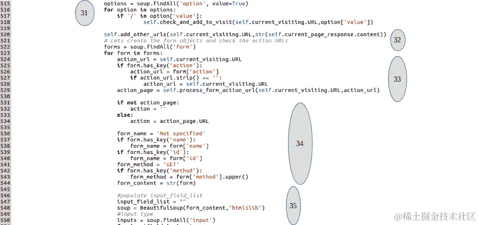 第(33)和第(34)节从当前 HTML 响应中提取所有表单。如果识别出任何表单,将提取并保存表单标签的各种属性,例如 action 或 method,保存在本地变量中: