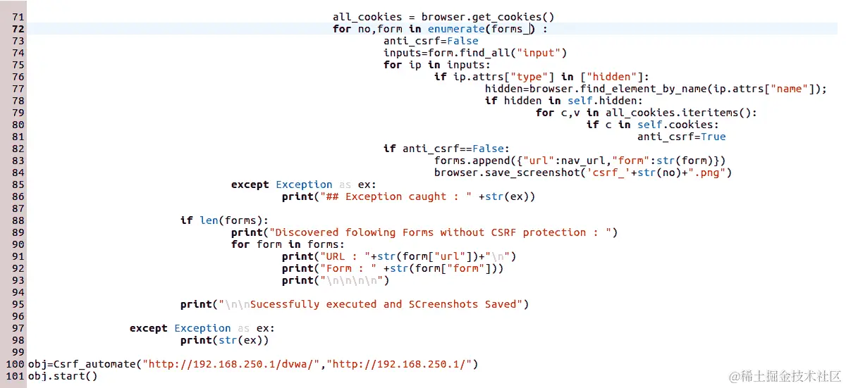 有时候,某些页面会返回重定向(3XX响应代码),我们需要适当保存 URL 和表单内容。假设我们向页面 X 发出了GET请求,响应中有三个表单。理想情况下,我们将以 X 为标记保存这些表单。但是,假设在向页面 X 发出GET请求时,我们得到了一个 302 重定向到页面 Y,并且响应 HTML 实际上属于设置重定向的网页。在这种情况下,我们最终会保存与 URL X 映射的三个表单的响应内容,这是不正确的。因此,在第(20)和(21)节中,我们处理这些重定向,并将响应内容与适当的 URL 进行映射: