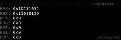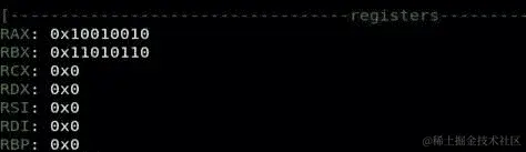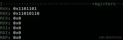 首先,我们将0x10111011移动到rax寄存器,然后将0x11010110移动到rbx寄存器: