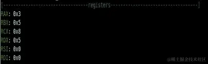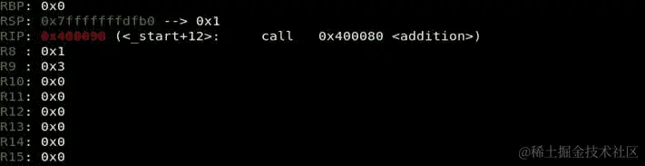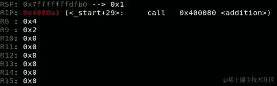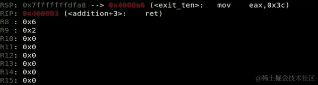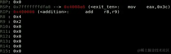 注意RSP现在指向下一个操作,我们在addition过程中,然后代码将会将两个数相加并将结果存储在R8寄存器中: