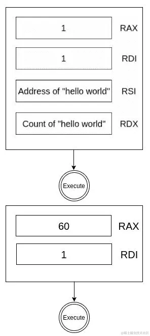 然后调用addition过程,它将把下一条指令推入堆栈,即mov rax, 60: