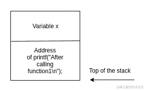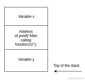 main函数将调用function1,在继续执行function1之前,将printf("After calling function1\n")的地址保存到堆栈中,以便继续执行流程。通过将变量y推入堆栈来完成function1后,它将执行printf("This is function1\n"),如下所示: