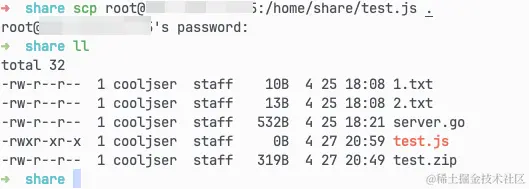 下载文件也可以使用 scp 来操作,比如我们的服务器上有一个 test.js文件,我们想把它下载到本地,那么可以执行这行命令 scp root@服务器ip:/home/share/test.js . 就可以了