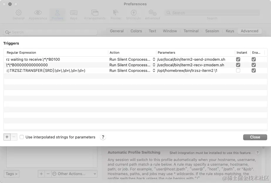 然后打开 iterm2 的配置,Profiles -> Defualt -> Advanced -> Triggers -> Edit -> 新增