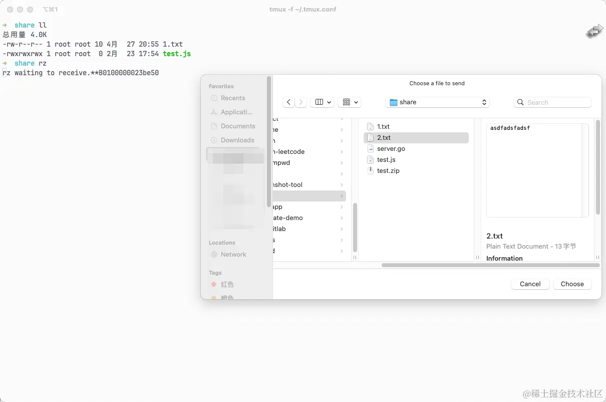 项目地址:trzsz.github.io/。trzsz 是一个简单的文件传输工具,而且兼容 tmux,一看介绍,这不就是我想要的吗?果断安装尝试一下