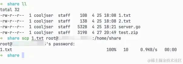 其实使用起来也还比较方便, 比如下面的例子,share目录下有一个1.txt文件,如果要使用 scp 命令来传到服务器上的话,需要执行 scp 1.txt root@服务器ip:/home/share注意将@后的地址替换成你自己的服务器 ip,分号后的路径是你要上传到的服务器目录