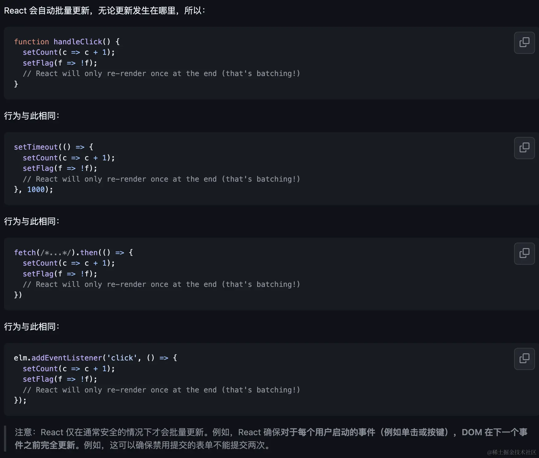 - 对异步和原生事件的批处理支持:与之前的版本相比,React 18可能在底层对异步操作和原生事件触发的状态更新进行了特殊处理,使得这些情况下的状态变更也能被有效地批处理。