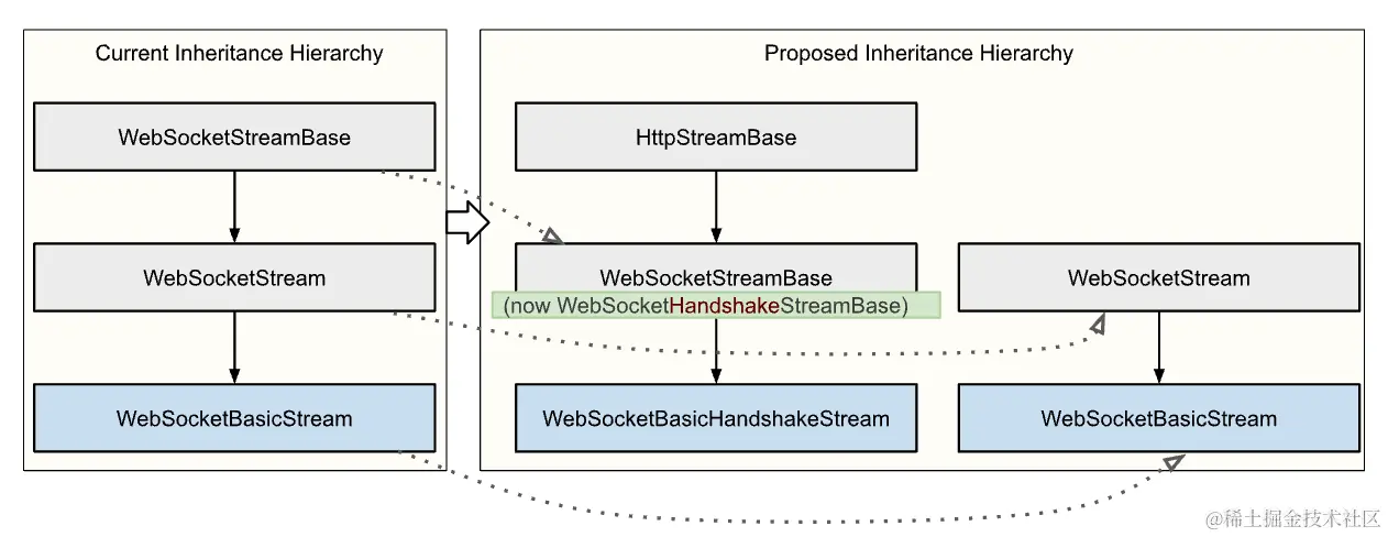 WebSocketStreamBase 将成为 HttpStreamBase 的子类,并更名为 WebSocketHandshakeStreamBase。可能需要对 WebSocketHandshakeStreamBase::Factory 接口进行一些更改。AsWebSocketStream() 虚拟方法将被删除。