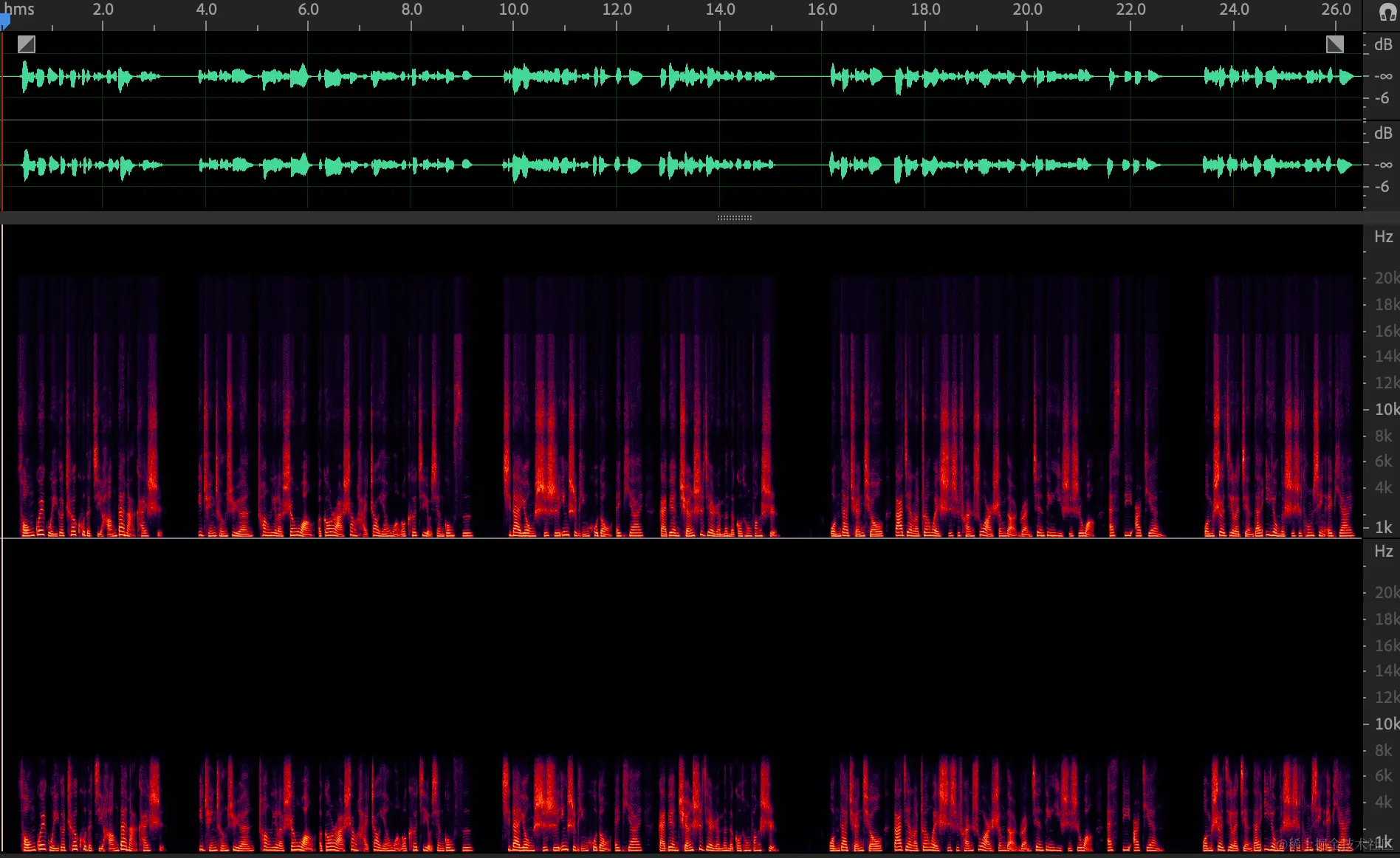 - 谱减法:核心思想是先取一段非人声段音频,记录下噪声的频谱能量,然后从所有的音频频谱中减去这个噪声频谱能量。这种方法对稳态噪声比较有效果。