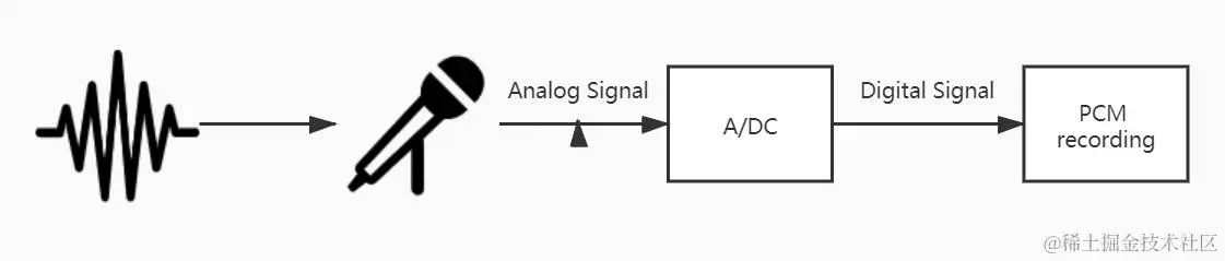 - 最后,通过 A/DC(模数转换器)将模拟信号转换成数字信号(Digital Signal)。即通过 PCM(Pulse Code Modulation)脉冲编码调制对连续变化的模拟信号进行抽样、量化和编码转换成离散的数字信号。