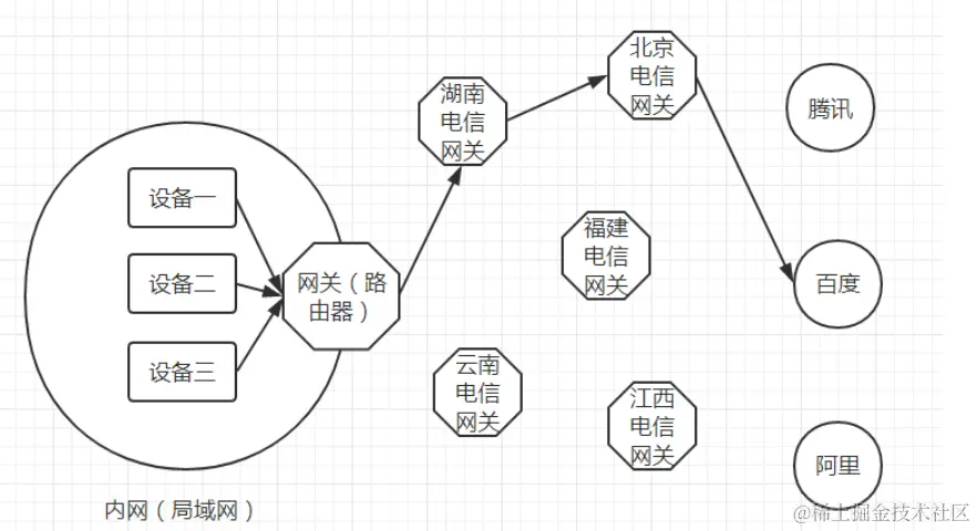 他发现你的收货地址在湖南,于是它可能从杭州出发,先去了福建的中转站,然后再到江西的中转站,突然发现江西到湖南的中转站不通,于是它只能再绕到广东的中转站,最后再到湖南中转站。这些中转站就相当于公网上的各个网关。