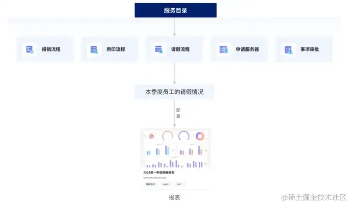 按照服务目录的报表,是对于某个模板本身的报表,如入职流程、合规风控流程、报障流程、请假流程等,按照工单本身的数据进行总结呈现的,如本月入职多少人、本月有多少电脑故障、本季度员工的请假情况等均可用报表进行直观查看。