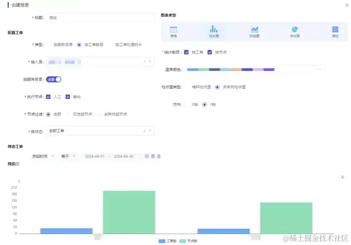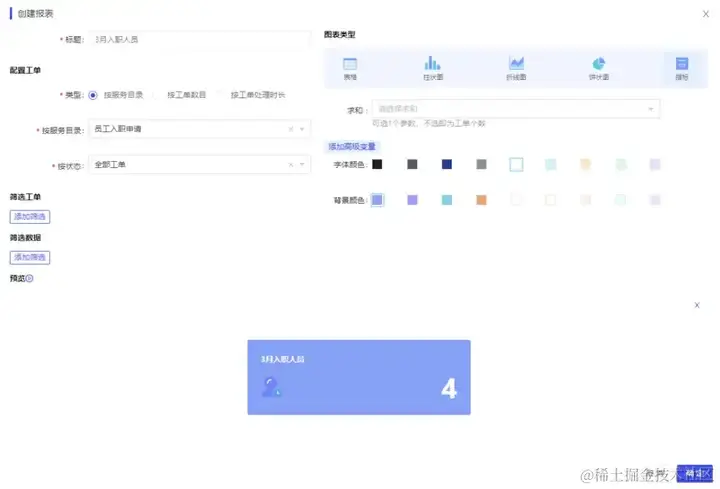 用户还可筛选工单、筛选工单数据,并且对工单中可加总的数据进行展示求和,除了指标外,对于表格、柱状图、折线图、饼状图等都可以进行支持。