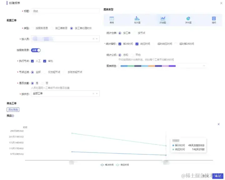 除工单数目外,另一个衡量运维人员工作的指标为工单处理时长,与工单数目类似,用户可通过如下配置查看员工的处理时长,同样对于SLA也可统计。