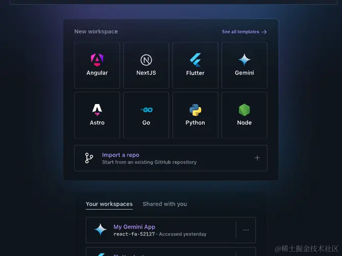 Project IDX 通过各种模板支持流行的框架,例如 Angular、Astro、Flutter、Go、Next.js、Python/Flask、React、Svelte 等,让你更轻松地构建跨多个平台运行的应用程序。你还可以使用 Nix 自定义环境,或从 GitHub 导入现有应用程序,支持大多数技术栈。