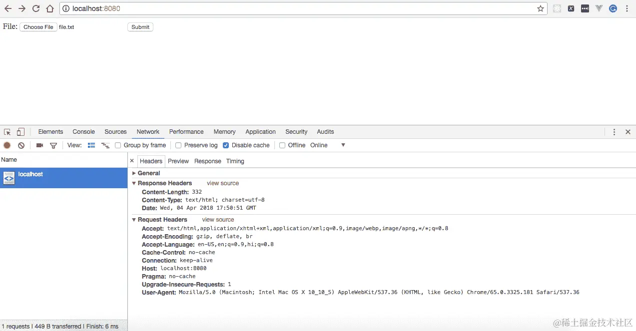 一旦我们运行程序,HTTP 服务器将在本地监听端口8080。浏览http://localhost:8080将会显示文件上传表单,如下面的屏幕截图所示: