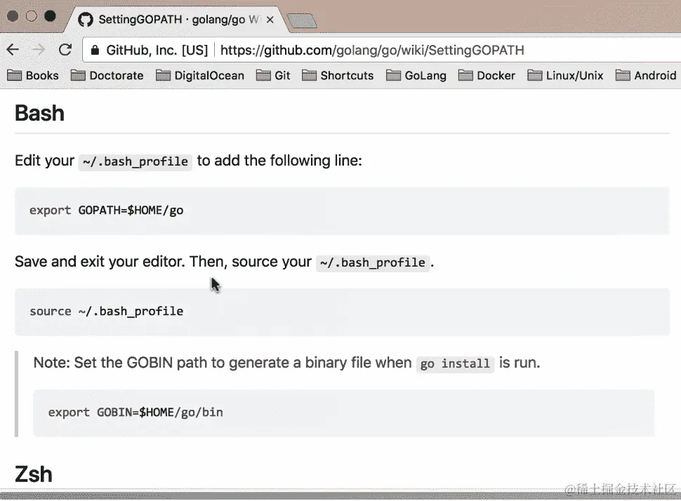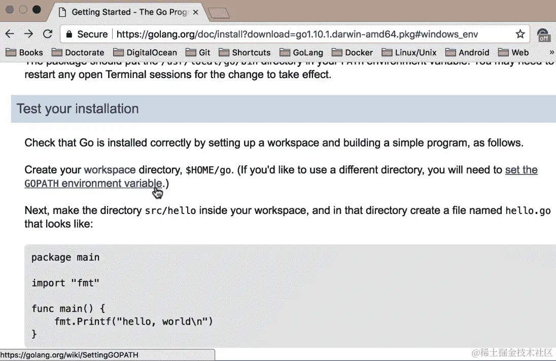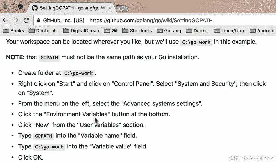 您还可以通过点击链接找出如何设置 Go 路径的环境变量,如下截图所示,该链接位于同一页面上: