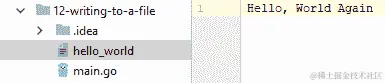 在这一部分,我们将看到如何写入文件。与读取文件类似,我们将使用ioutil包。我们将使用ioutil.WriteFile函数,它接受三个参数。第一个参数是我们要写入的文件名,第二个是我们要写入的数据,最后一个是文件权限。这里的优势是,如果文件不存在,WriteFile将使用perm参数给出的权限创建文件,如果文件已经存在,则在写入之前将截断文件。我们将继续往我们的文件中写入一些内容,因为我们的文件还不存在,它会为我们创建一个新文件。我们将写入Hello, World,这是一个string参数,我们将把它转换为byte数组,然后才能传递给WriteFile。文件名将是hello_world,第二个参数将是hello变量的字节表示。这将返回一个错误。如果它不是nil,意味着发生了某些事情。让我们检查一下代码: