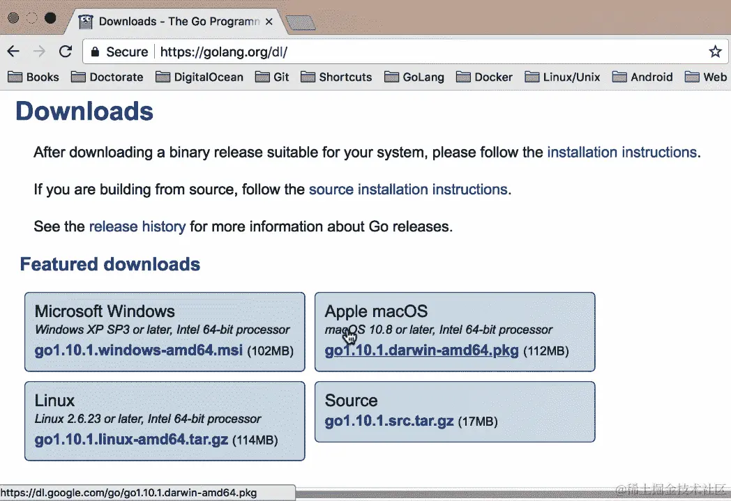 要安装 Go 二进制文件,首先要做的是转到以下链接:golang.org/doc/install;您也可以直接在 Google 中搜索并访问它。您将找到一个逐步指南,介绍如何在不同平台和操作系统上安装 Go。如果您点击“下载 Go”,它将带您到下载页面,在那里您可以找到各种二进制格式。